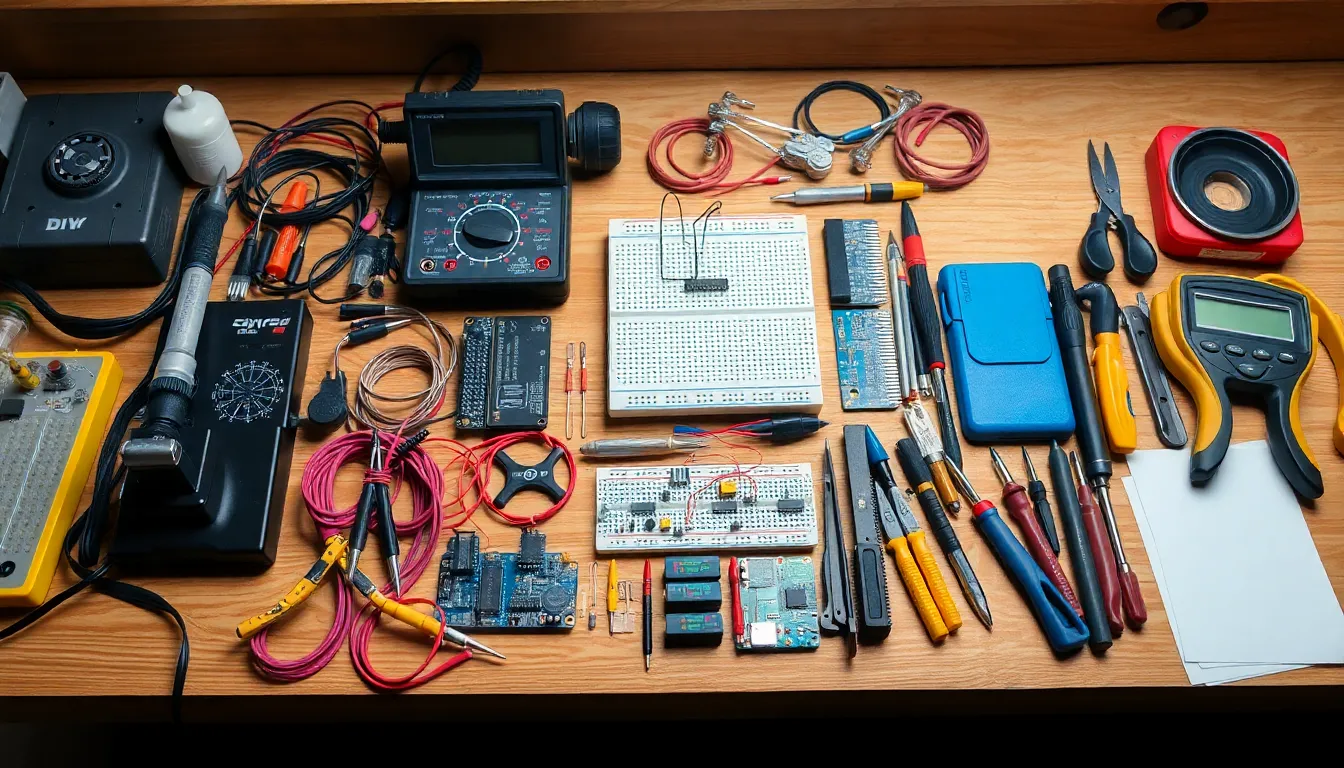 Soldering iron is crucial for connecting components securely. Wire cutters and strippers facilitate precise adjustments. Multimeter measures voltage, current, and resistance, confirming that circuits function properly. Breadboards allow easy assembly and modification of prototypes without soldering. Jumper wires connect various parts of the circuits, making flexibility achievable. Screwdrivers assist in securing components and casings. Together, these basic tools form the foundation for any DIY electronics project.